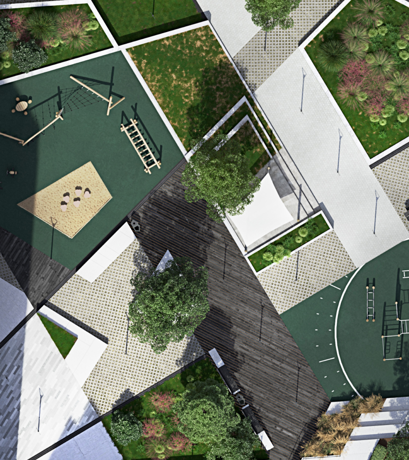 Conceptual housing project within the boundaries of Koltsova-Kramskogo streets in Minsk. The block includes the development of 3 houses with a stylobate in the form of underground parking, which excludes the presence of cars outside the courtyard, as well as inside of it.