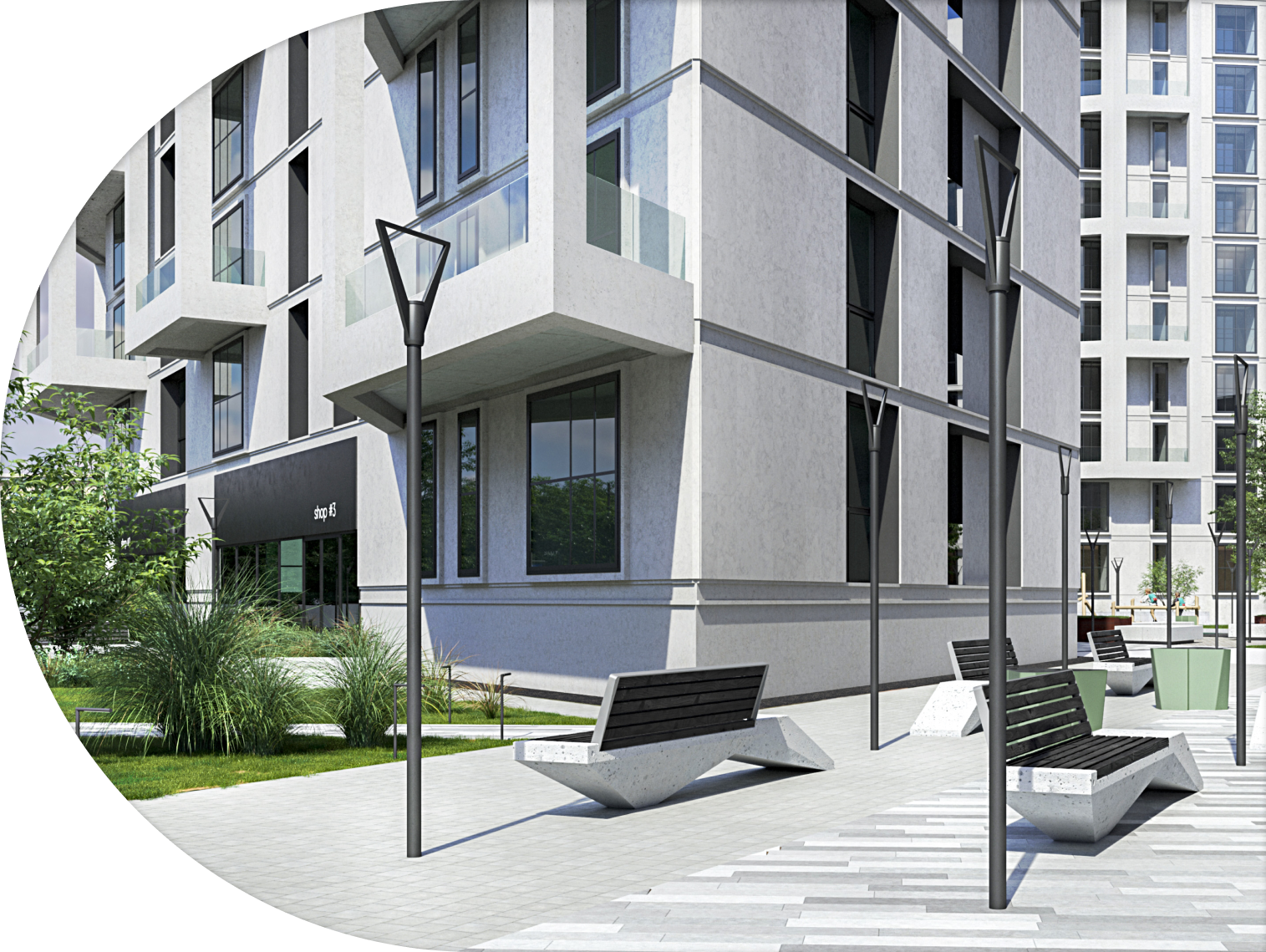 Comfortable recreation areas and infrastructure with many benches and platforms will allow each tenant to find their own comfortable place for socializing and walking in the fresh air.