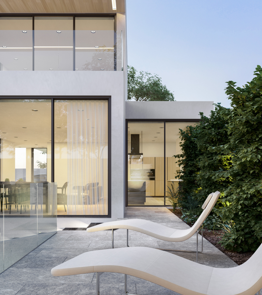 Ландшафт увязан бассейном с шезлонгами, улавливающими солнечный свет в разное время суток. Главный П-образный элемент благоустройства зонирует территорию, создавая тем самым разноплановость жизненных сценариев.