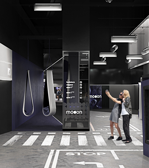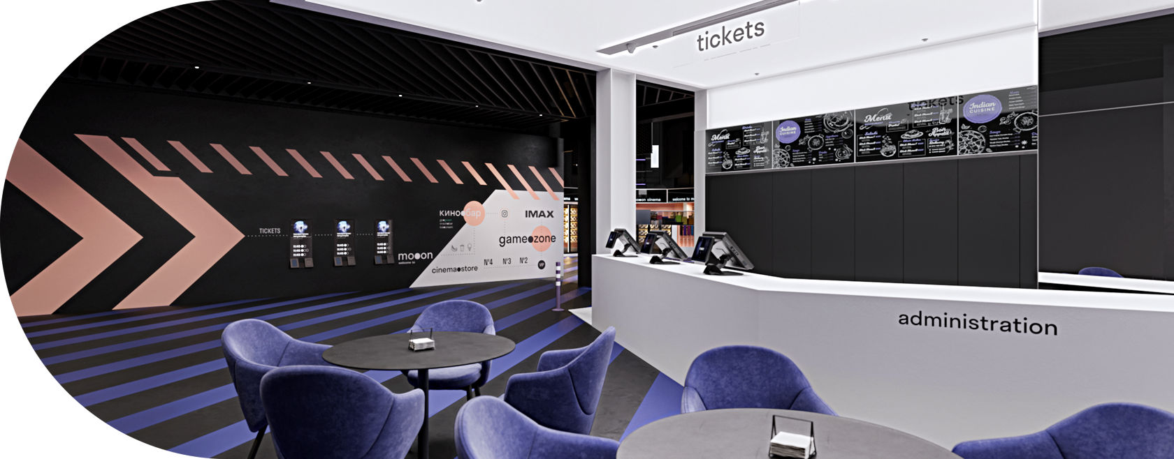 Сам кинотеатр расположен внутри торгового центра, основной концепцией которого является тема города. Было принято решение создание собственного, с нестандартным использованием цвета и форм.