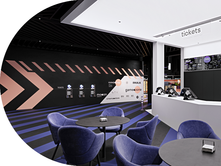 On the territory of the cinema there is a cafe, ticket offices with self-service ticket kiosks, concession area, gaming zone, vip lounge with the possibility of catering, 5 cinema halls with a total capacity of 850 people, a terrace, a personal movie theater, a gaming room, vip rooms, as well as a bookstore and a souvenir store.